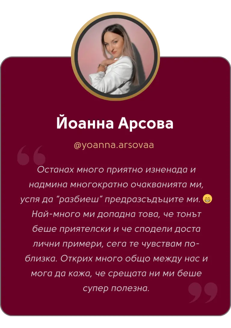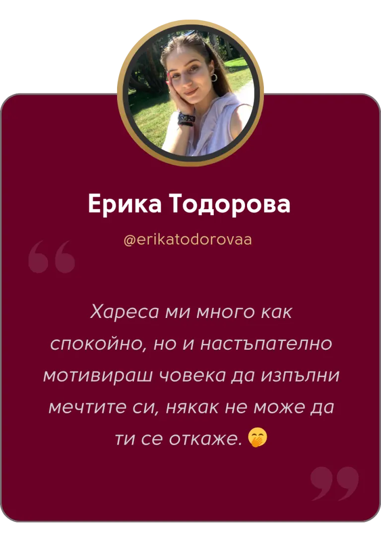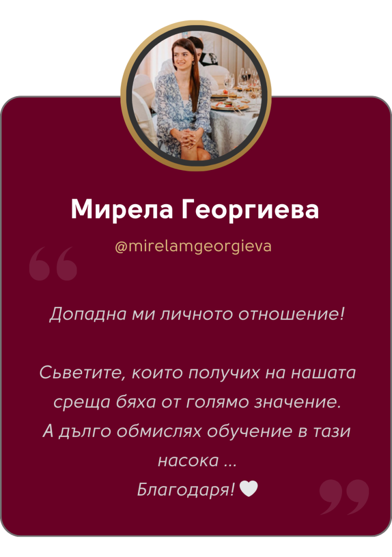 С над 5 години опит в работата с жени лидери и професионалисти, помогнах на десетки хора да превърнат мечтите си в конкретни цели и да ги постигнат с лекота. Като майка на две деца и успешен предприемач, знам колко е важно да намериш баланс между личния и професионалния живот, и вярвам, че успехът е постижим за всеки, когато имаш ясен фокус и работещ план. Присъедини се към „Визия 2025“ и нека заедно изградим стратегията за най-добрата ти година досега!